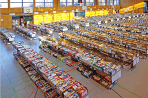 Zum größten Bücherflohmarkt Bayerns zu kommen lohnt sich. Auf 1200 qm werden 2000 Bananenkisten voller Bücher angeboten, die in etwa 150 Kategorien sortiert sind.
