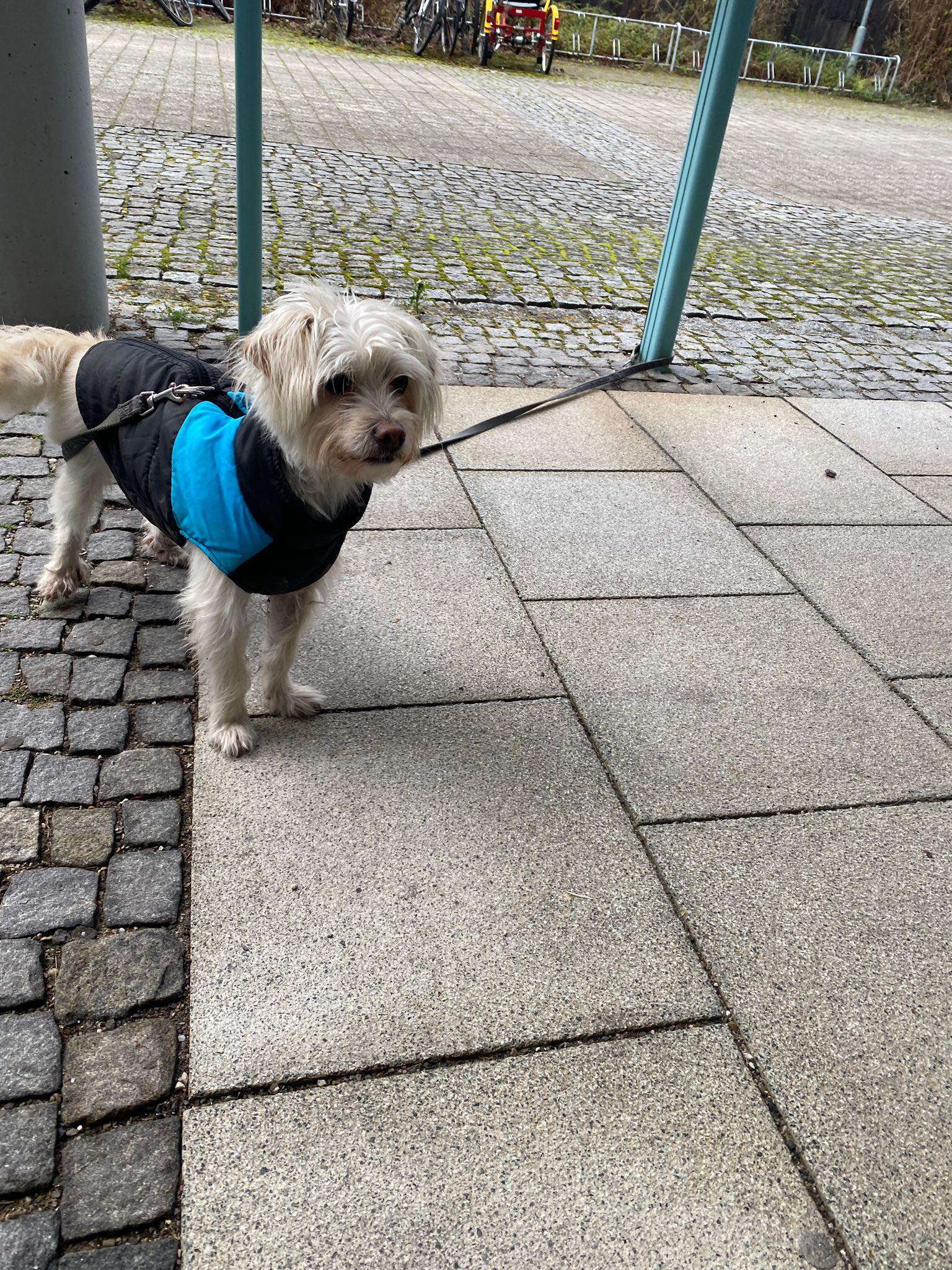 Kleiner weißer Hund herrenlos mit Leine und Mäntelchen mitten in Olching gefunden