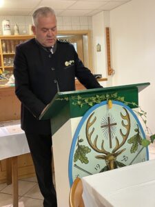 Im Anschluss daran begaben sich alle Gäste und Vereinsmitglieder in das keine 100 Meter entfernte Schützenheim von Waidmannsheil Neu – Esting e. V..Der festlich herbstlich eingedeckte Aufenthaltsraum des Vereinsheims füllte sich vollständig und nach einer kurzen Einleitung durch den 1. Schützenmeister, Robert Schweyer, gab es zuerst eine kräftige Brotzeit mit Weißwürsten, Wienern, Brezen und passenden Getränken.