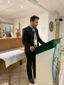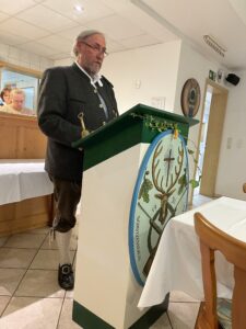 Im Anschluss daran begaben sich alle Gäste und Vereinsmitglieder in das keine 100 Meter entfernte Schützenheim von Waidmannsheil Neu – Esting e. V..Der festlich herbstlich eingedeckte Aufenthaltsraum des Vereinsheims füllte sich vollständig und nach einer kurzen Einleitung durch den 1. Schützenmeister, Robert Schweyer, gab es zuerst eine kräftige Brotzeit mit Weißwürsten, Wienern, Brezen und passenden Getränken.