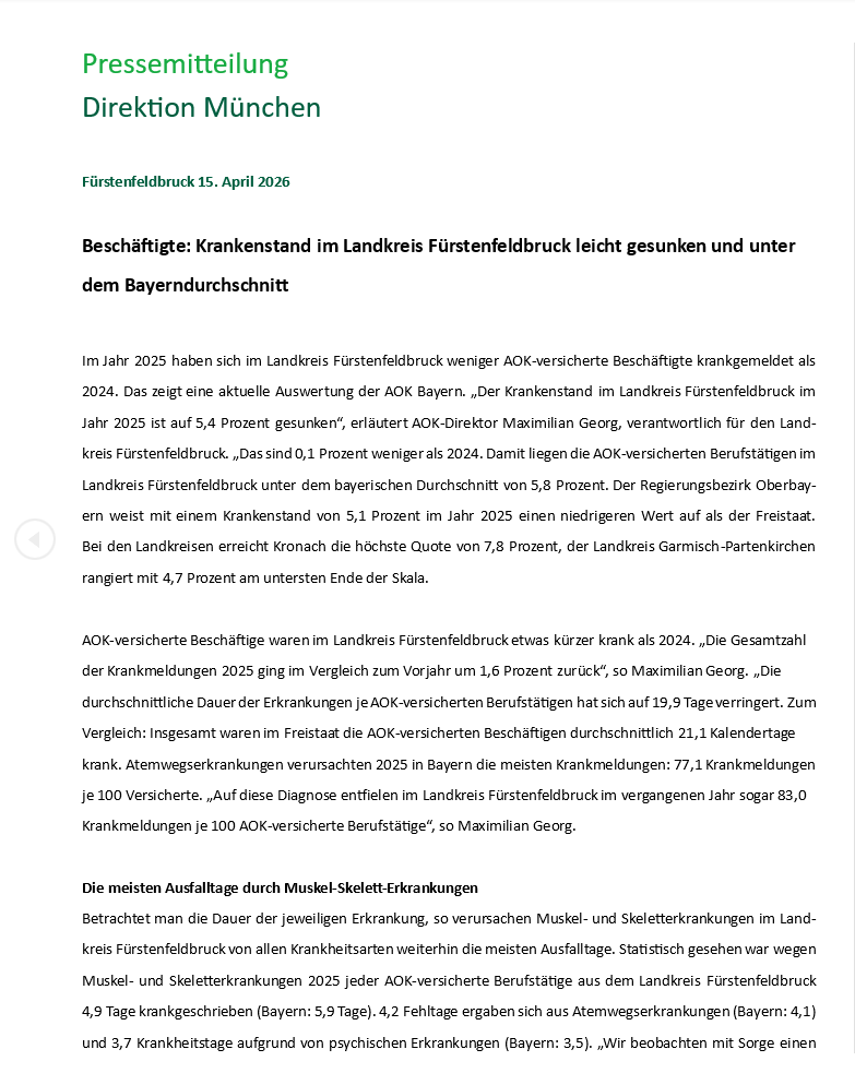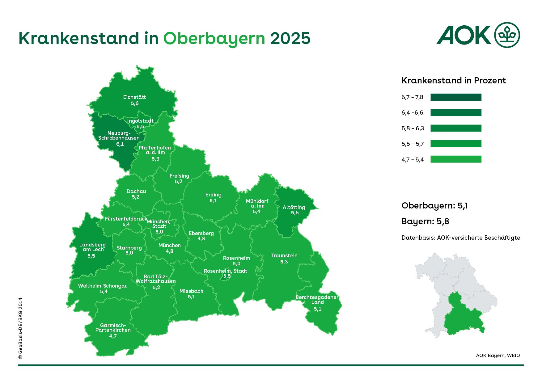 Übersicht über den Krankenstand der AOK-versicherten Beschäftigten in Oberbayern 2025.