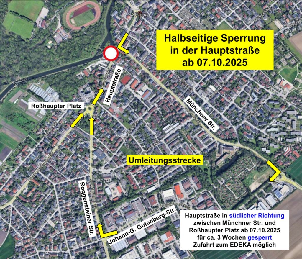 Im Zuge des barrierefreien Haltestellenumbaus „KOM“ werden sich ab dem 07.10.2025 Einschränkungen in der Hauptstraße zwischen Roßhaupter Platz und der Zufahrt Edeka ergeben. Die Dauer der Bauarbeiten wurden mit drei Wochen angesetzt. In dieser Zeit wird der Verkehr mittels Einbahnregelung im o.g. Bereich in Richtung Zentrum geleitet. Die Umleitungsstrecke ortsauswärts wird ausgeschildert und verläuft über die Münchner Straße, Johann-G.-Gutenbergstraße und Roggensteiner Straße. Die Zufahrt zu den ansässigen Gewerbetreibenden als auch zu den Veranstaltungen der Kulturwerkstatt (KOM) ist möglich. Ortseinwärts wird während der Bauzeit eine provisorische Bushaltestelle „KOM“ eingerichtet. Ortsauswärts entfällt die Haltestelle „KOM“. Wir bitten auf die nahegelegenen Haltestellen „Roßhaupter Platz“ oder „Auf der Insel“ auszuweichen.