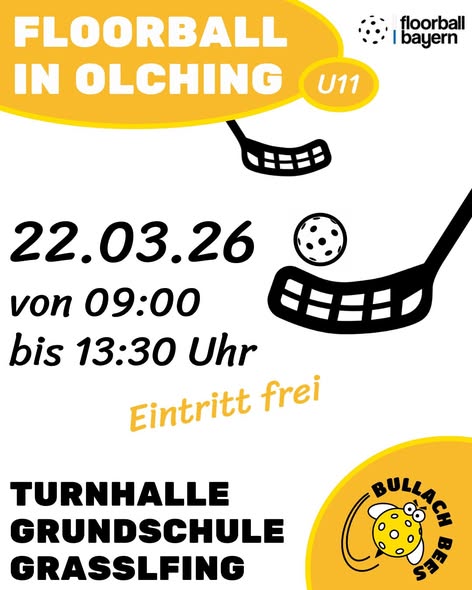 Am 21. und 22. März rollt wieder die kleine, schnelle Floorball-Kugel in der Halle der Grundschule Graßlfing in Olching. Unsere U13 und unsere U11 richten jeweils einen Heimspieltag in der Liga von @floorball_bayern aus. 🏒🐝💛 Erwartet werden Teams aus ganz Bayern: @fbcmuenchen @mad_dogs_hunderdorf @floorballcoburg1848 @lumberjacks.rohrdorf @floorball_puchheim @psvmuenchen