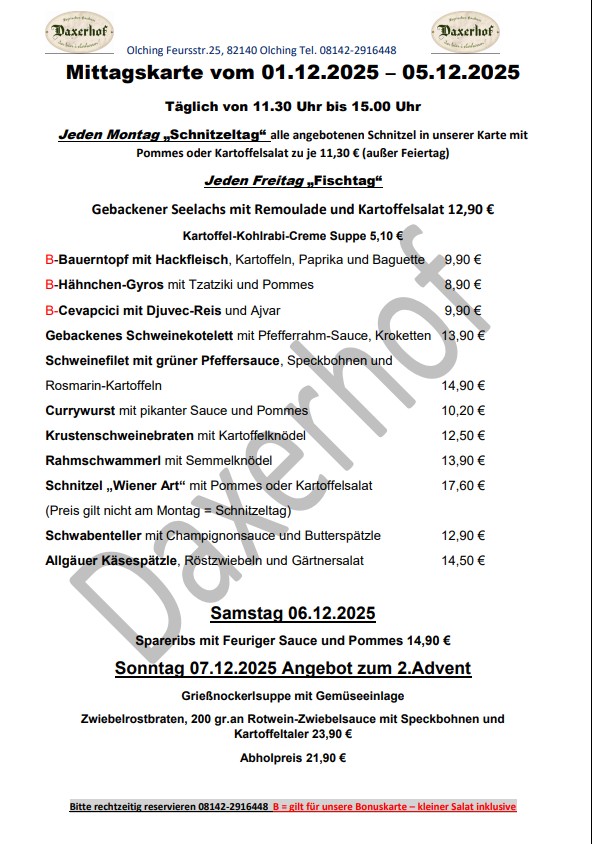 - Daxerhof -Mittagskarte vom 01.12.2025 – 05.12.2025