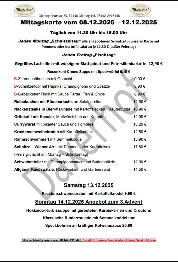 Daxerhof – Mittagskarte vom 08.12.2025 – 12.12.2025