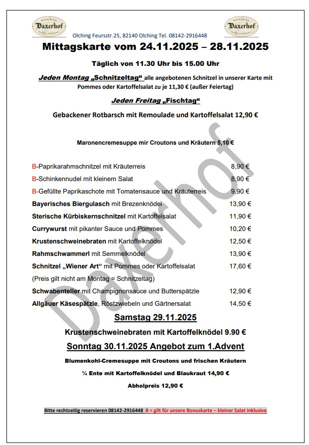 Daxerhof – Mittagskarte vom 24.11.2025 – 28.11.2025