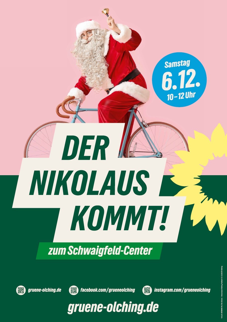 Am Samstag, 6. Dezember, macht der Nikolaus Station am Schwaigfeld-Center in Olching – mit kleinen Leckereien und jeder Menge grüner Politik! Die Grüne Bürgermeisterkandidatin Laura Müller, Kandidat*innen der Grünen Liste und Stadtratsmitglieder freuen sich auf interessante Gespräche.