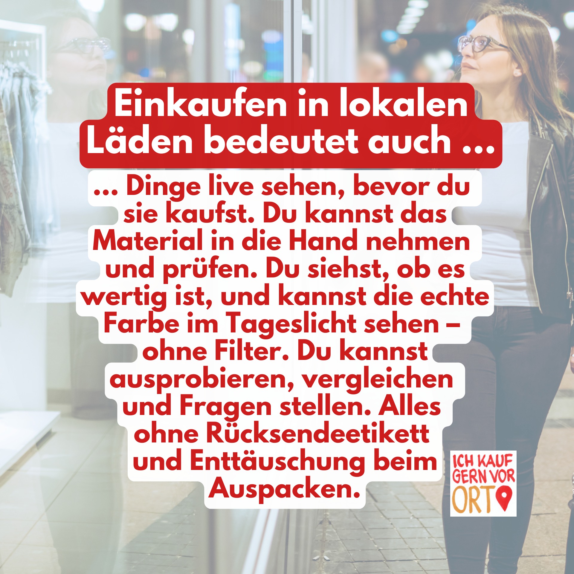 Du gehst durch die Innenstadt, schaust ins Schaufenster oder in den Laden, lässt dich inspirieren. Du hältst das Produkt in der Hand, prüfst die Verarbeitung, merkst sofort: Passt oder passt nicht. Nicht drei Tage warten. Nicht hoffen, dass es aussieht wie auf dem Bild. Nicht wieder ein Paket zurückschicken. Sondern bewusst entscheiden. Und mit einem guten Gefühl nach Hause gehen.