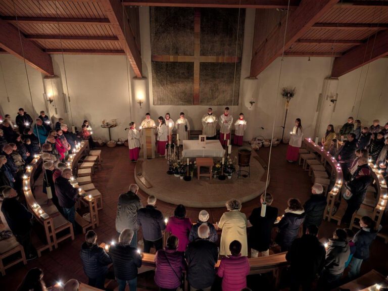 Die Feier der Osternacht begann mit dem traditionellen Feuer im Innenhof. Nach dem Einzug und dem Lumen Christi wurde das Licht in der Runde ausgeteilt. Es folgten der Wortgottesdienst mit dem festlichen Gloria und die Taufwasserweihe, ehe die Eucharistie gefeiert wurde.