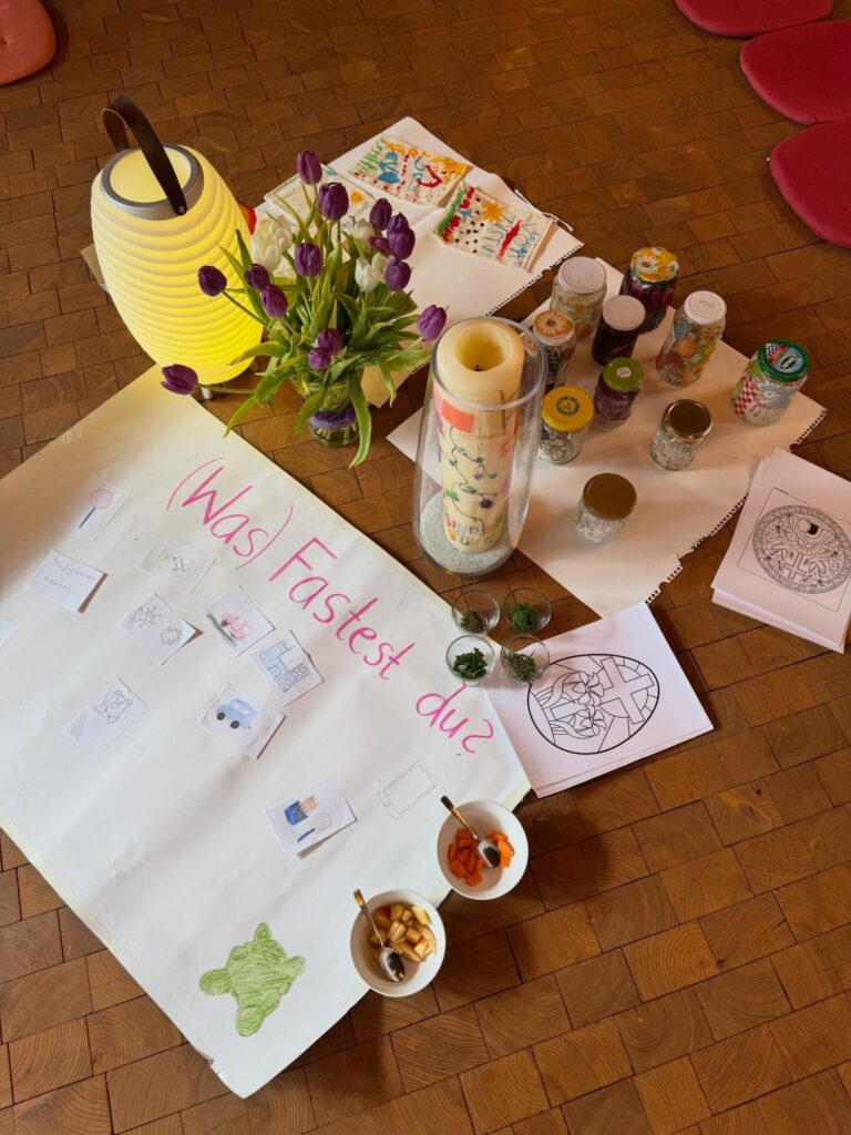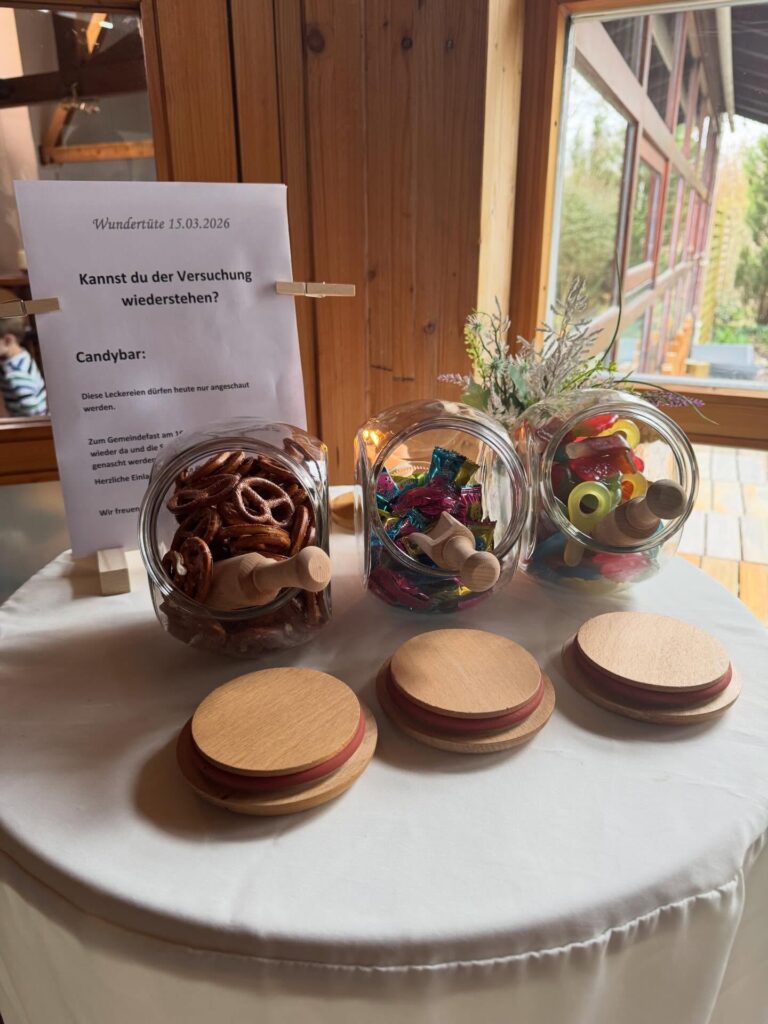 Impressionen von der heutigen Wundertüte zum Thema „Fasten“ – selbst die Candybar der Versuchung hat es überstanden. Kommt alle zum Gemeindefestival nach Maisach im Mai, dort darf die Candybar dann geplündert werden.