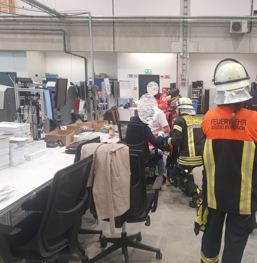 „Person in Maschine eingeklemmt“ lautete die Alarmmeldung heute morgen gegen 09:12 Uhr. Aus uns unbekannter Ursache geriet eine Person in einem Geiselbullacher Gewerbegebiet mit einer Hand in die rotierenden Walzen einer Papierverarbeitungsmaschine. Anwesende Kolleginnen und Kollegen reagiert schnell und umsichtig: sie setzten einen Notruf ab und begannen dann sofort mit der Demontage der Anlage um die Person aus ihrer misslichen Lage zu befreien. Als wir am Einsatzort eintrafen, war die Person bereits aus ihrer Zwangslage gerettet. Wir übernahmen die Erstversorgung und übergaben die verletzte Person an den wenig später eintreffenden Rettungsdienst. Die Person musste in ein Krankenhaus transportiert werden.