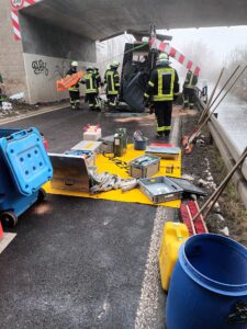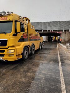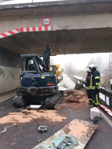 Leider kam es nicht nur auf der Münchener Straße zu einer längeren Vollsperrung. Auch der Bahnverkehr musste aufgrund vermuteter Beschädigungen an der Bahnunterführung zunächst eingestellt werden. Nach erfolgter Prüfung des Bauwerkes von Seiten der Deutschen Bahn konnte dieser aber wieder zeitnah freigegeben werden. Die Münchener Straße musste allerdings für über vier Stunden voll gesperrt bleiben.