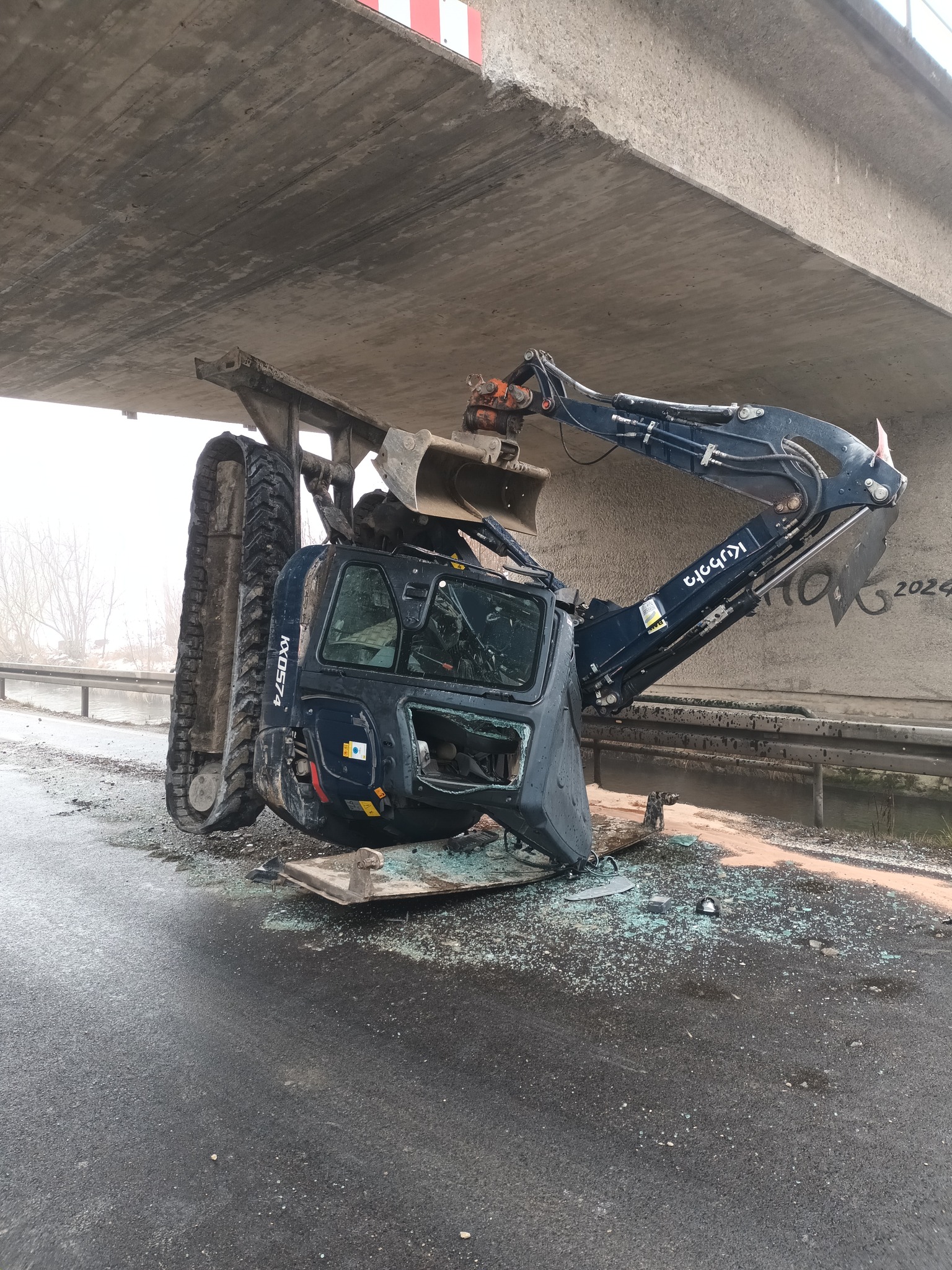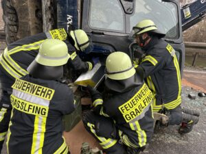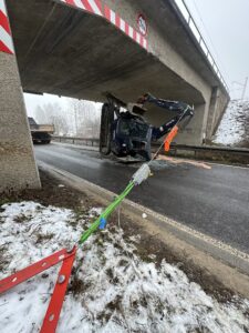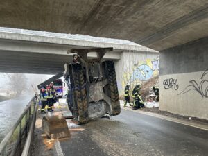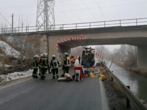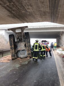 Am 30.01.2026 um 12:23 Uhr wurden wir zu einer Ölspur im Bereich der Bahnunterführung der Münchner Straße in Eschenried alarmiert. Hier sollte ein auf einem LKW beladener Bagger hängengeblieben sein, wobei auslaufendes Hydrauliköl gemeldet wurde. Beim Eintreffen unserer Einsatzkräfte an der Unfallstelle stellte sich die Situation jedoch gravierender dar als gedacht. Beim Versuch die Bahnunterführung zu durchfahren, erfasste der Arm des Baggers das Bauwerk und wurde von der Ladefläche des LKW gerissen. Die Baumaschine kippte rückwärts auf die Fahrbahn und blieb mit schweren Beschädigungen im Bereich der Unterführung senkrecht liegen. Unsere ersteingetroffenen Kräfte forderten sofort die Unterstützung der Feuerwehr Graßlfing nach und richteten die Vollsperrung der Münchner Straße ein. Anschließend wurden große Mengen an ausgetretenem Kraftstoff gebunden, um ein abfließen in den angrenzenden Gröbenbach zu verhindern. Die Kameraden der Feuerwehr Graßlfing sicherten mittels Seilwinde die verunfallte Baumaschine unmittelbar gegen ein eventuelles kippen. Zudem wurde der Kraftstofftank abgepumpt, um eine größere Belastung der Umwelt zu verhindern. Der Bagger musste dann durch ein hinzugezogenes Abschleppunternehmen geborgen werden, wozu mehrere Abschleppfahrzeuge nötig waren.