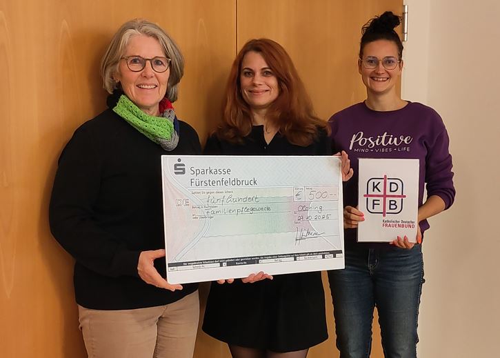 Der Katholische Frauenbund Zweigverein Olching hat dem Familienpflegewerk eine Spende in Höhe von 500 Euro überreicht. Damit möchte der Frauenbund gezielt Familien in schwierigen Lebenssituationen unterstützen. Die Vorsitzende des Frauenbunds, Larissa Limbrunner, betonte: „Uns ist es wichtig, dort zu helfen, wo Unterstützung direkt bei den Familien ankommt. Das Familienpflegewerk leistet hier wertvolle Arbeit.“