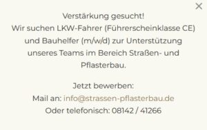 Wir sind ein zertifizierter Meisterbetrieb für Straßen und Pflasterbau. Dadurch sind wir auch qualifiziert auf öffentlichem Grund und Boden diese Arbeiten auszuführen!