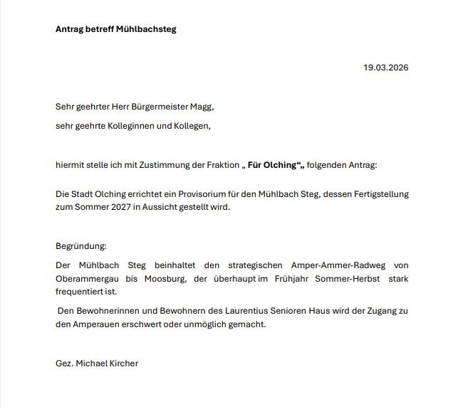 Für Olching fordert: Provisorische Brücke am Mühlbach – wichtige Alltagsverbindung muss schnell wiederhergestellt werden