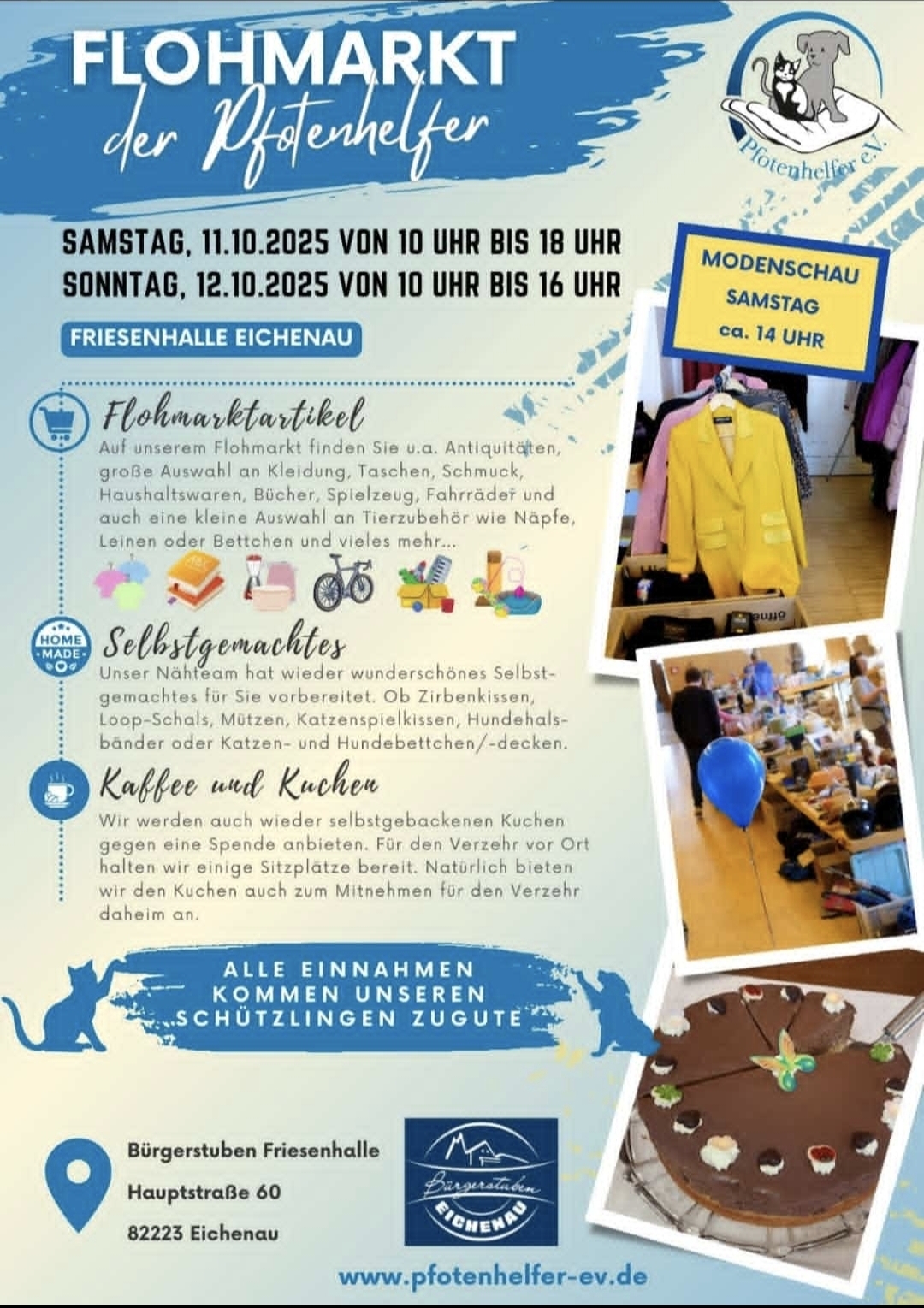 Der Pfotenhelfer Flohmarkt ist wieder am Start und es warten viele tolle Sachen auf euch: Antiquitäten, Kleidung, Selbstgenähtes für Tier und Mensch, Schmuck, Geschirr und dieses Jahr sogar eine Modenschau!