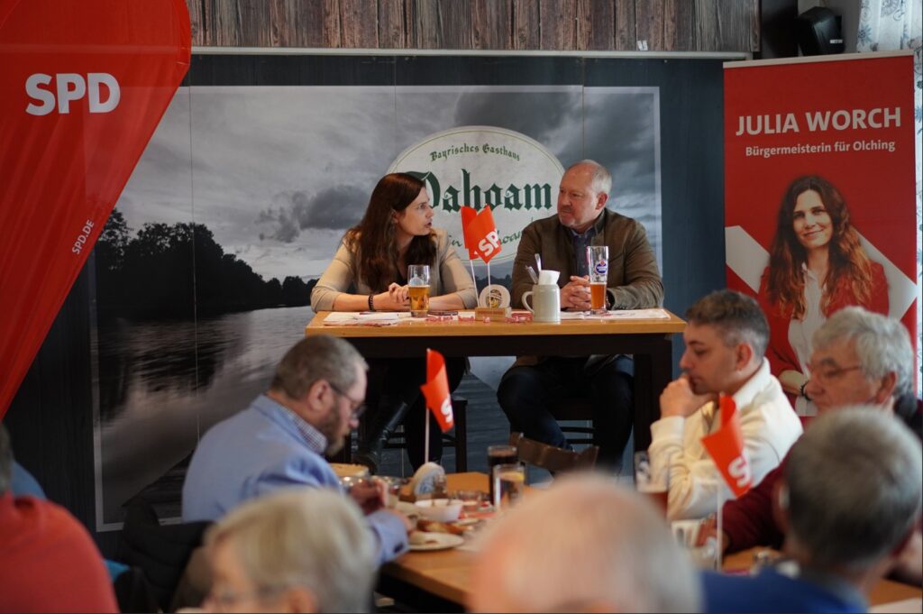So entwickelte sich am Sonntagvormittag im Olchinger „Dahoam“ bei Weißwurst und Obazda eine lebhafte, produktive Diskussion über Themen wie städtische Mietwohnungen, Gewerbesteuereinnahmen, bargeldloses Bezahlen in Geschäften, echte und digitale Schaufenster.