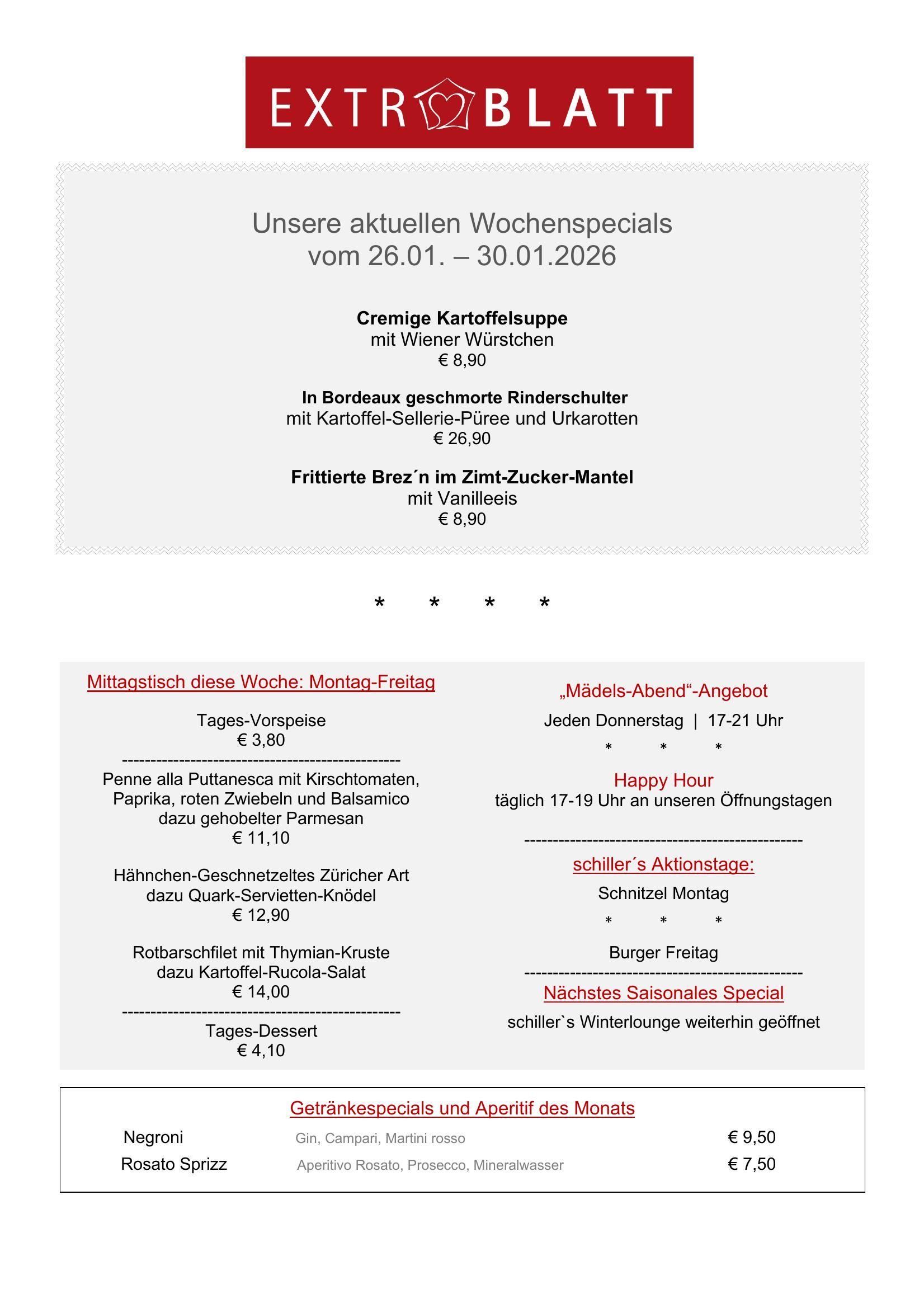 Hotel Schiller Olching: Wochenspecials vom 26.1-30.1.2026