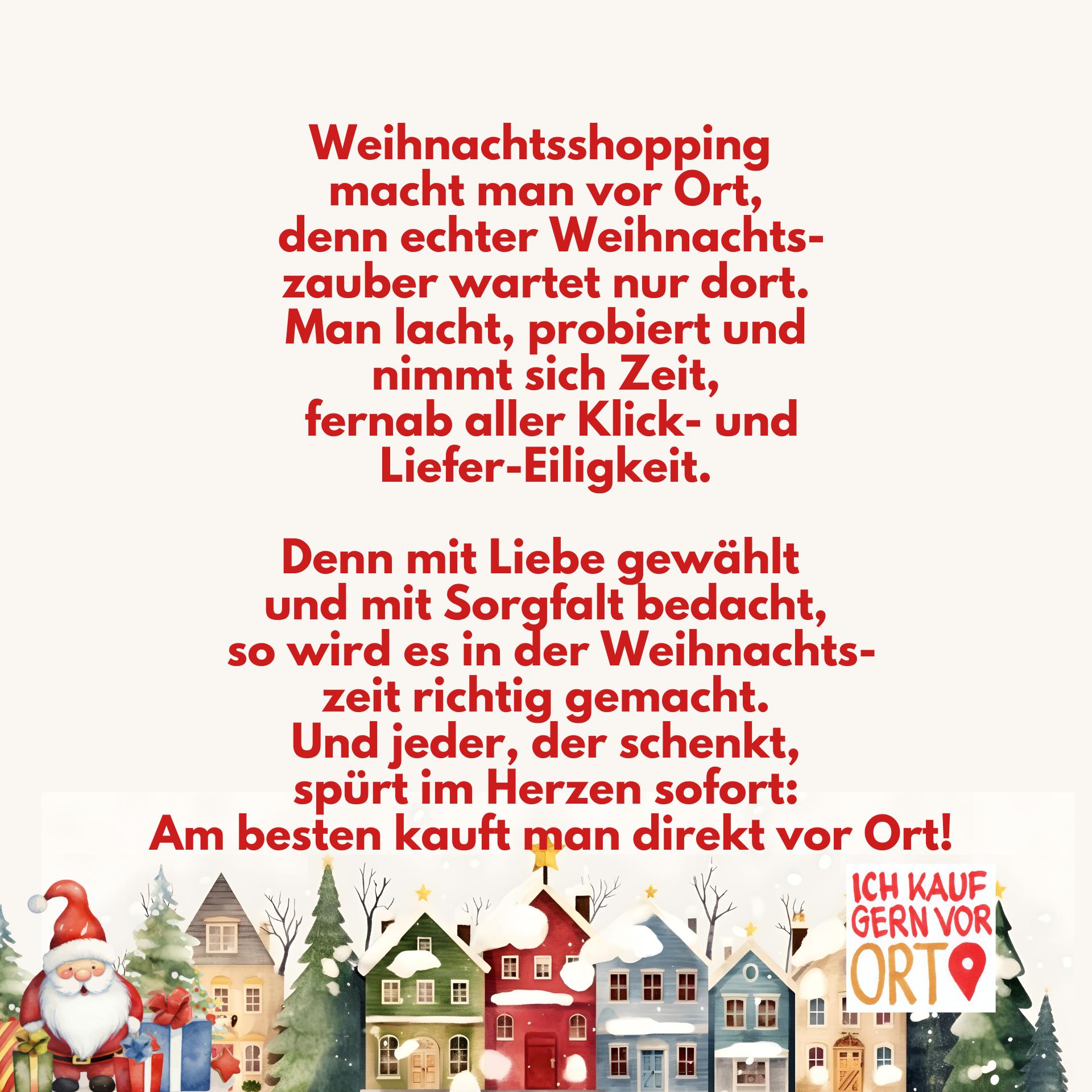 Das passiert nicht online. Das passiert vor Ort – da, wo du anfasst, fragst, ausprobierst, lachst. Leise weihnachtliche Musik, der Duft nach gebrannten Mandeln und Glühwein, liebevolle Deko in den Schaufenstern – beim Bummel durch die Läden beginnt die Weihnachtsfreude ganz von selbst. Man entdeckt Dinge, die genau passen.
