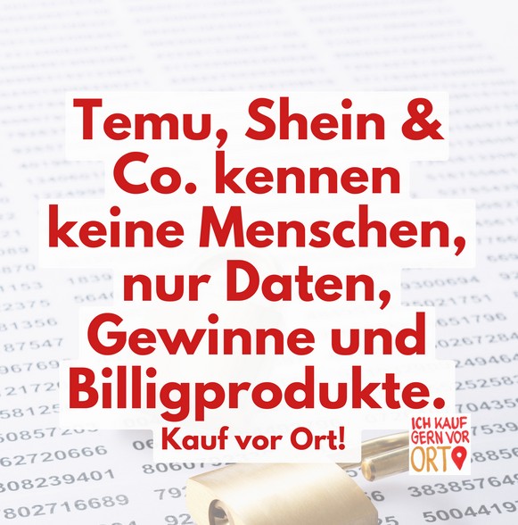 Temu, Shein & Co. interessieren sich nicht für dich – nur für dein Klickverhalten und deine Bestellung. Im Laden um die Ecke wirst du begrüßt, nicht gescannt. Hier nimmt sich jemand Zeit, hört zu, berät dich ehrlich – oft seit Jahren. Wenn wir vor Ort kaufen, stärken wir echte Begegnungen, kurze Wege und unsere Gemeinschaft. Nicht Datenströme und Gewinnmaximierung.