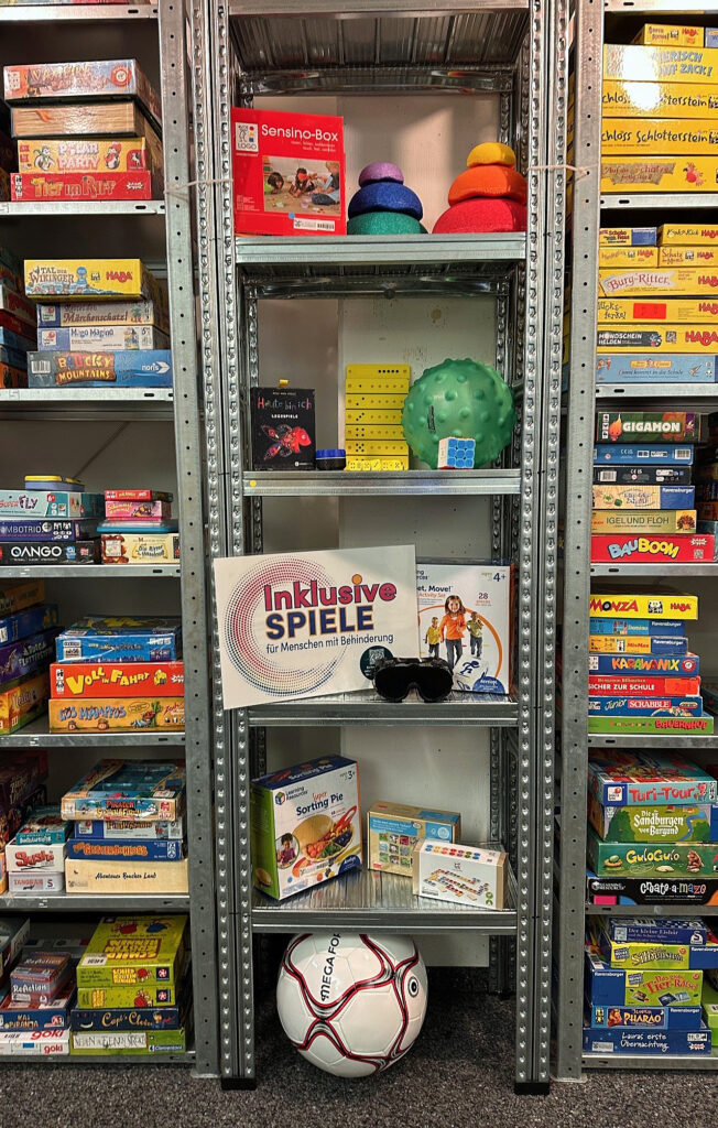 Das neue Spieleregal umfasst eine Auswahl an Brett-, Karten- und Lernspielen, die speziell entwickelt oder ausgewählt wurden, um Barrieren abzubauen. Dazu gehören Spiele mit taktilen oder farbkodierten Elementen, unterstützenden Symbolen, variablen Schwierigkeitsgraden sowie Spiele, die die Feinmotorik fördern.