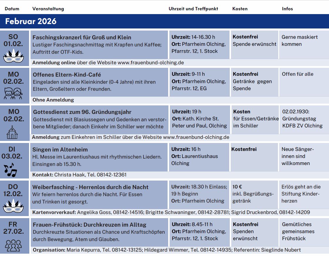 Kath. Frauenbund Olching: Programm für Feb. 2026
