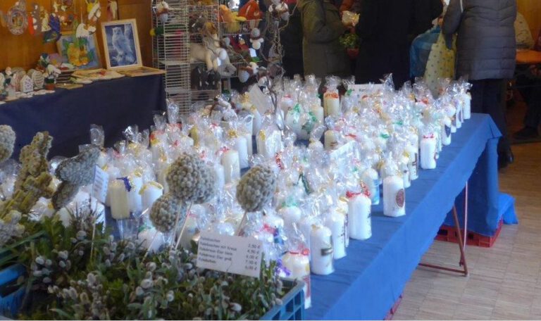 | Bereits am Vortag des Palmsonntags öffnete der traditionelle Osterbasar des Bastelkreises St. Elisabeth e.V. seine Pforten. Palmbuschen, Osterkerzen, Deko-Ostereier und andere Bastelutensilien wurden verkauft und fanden großen Anklang. Der Erlös des Basars ist für das Kinderhospiz St. Nikolaus im Allgäu bestimmt. |