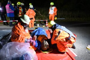Als Übungsszenario wurde ein Verkehrsunfall simuliert, bei dem sich mehrere Personen verletzten. Zudem wurde angenommen, dass radioaktives Material aus einem defekten Transportbehälter ausgetreten ist.