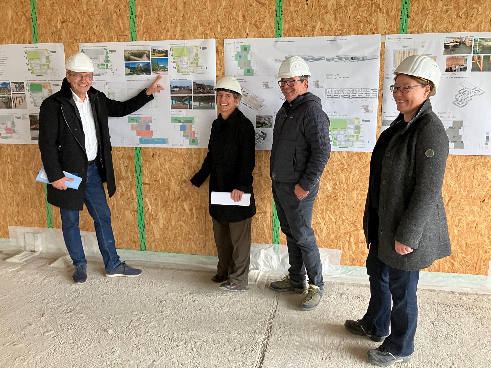Landrat Thomas Karmasin besucht die Baustelle am Gymnasium Olching anlässlich des Starts des Innenausbaus. (v.l. Landrat Thomas Karmasin, Sabine Stannecker Referatsleitung Kreiseigener Hoch- & Tiefbau, Stefan Arlt Geschäftsführer GHK Architekten, Daniela Egle Projektleitende Technikerin, Kreiseigener Hochbau). Foto LRA FFB
