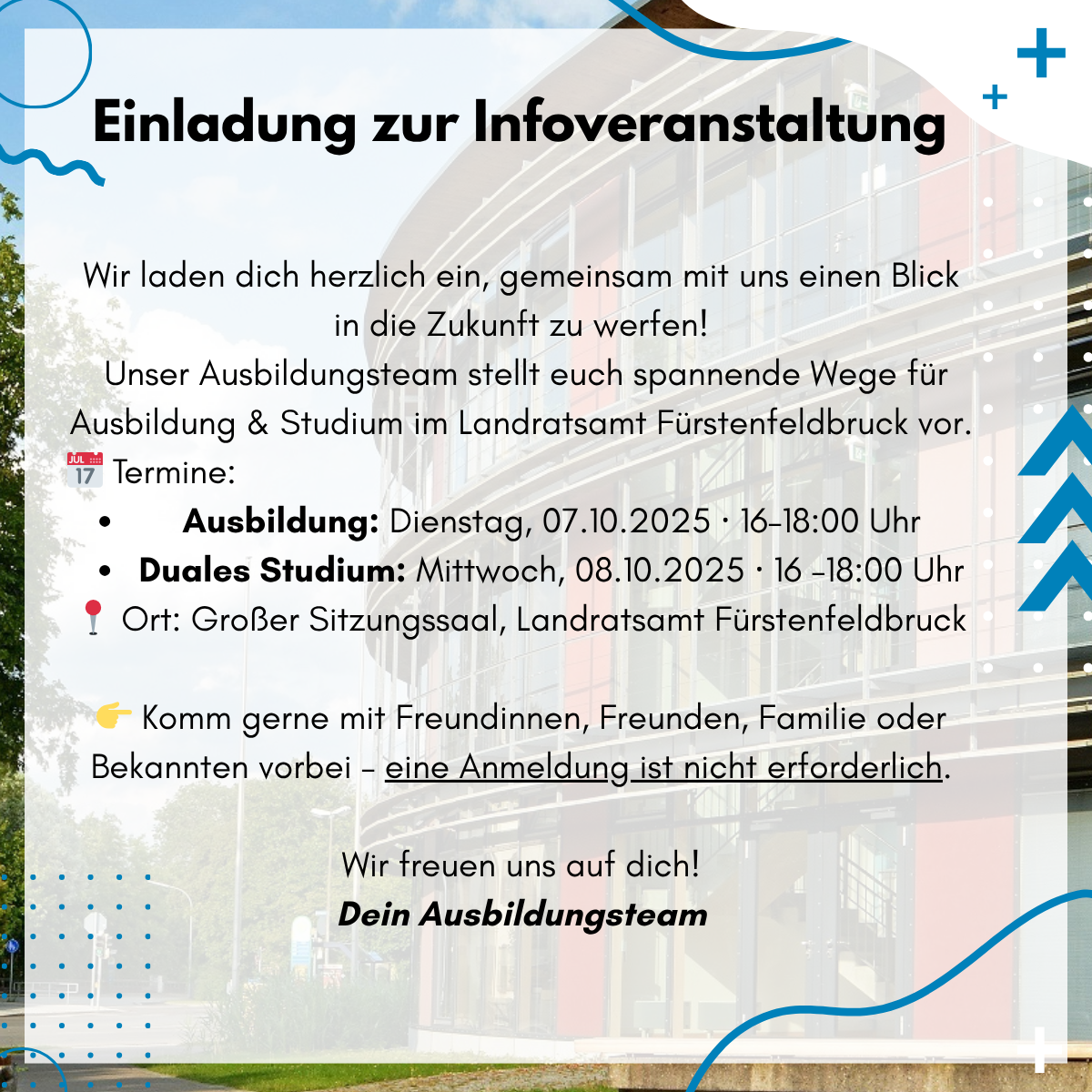 Unser Ausbildungsteam veranstaltet im Oktober zwei spannende Info-Nachmittage rund um die Themen Ausbildung und Studium im Landratsamt Fürstenfeldbruck.