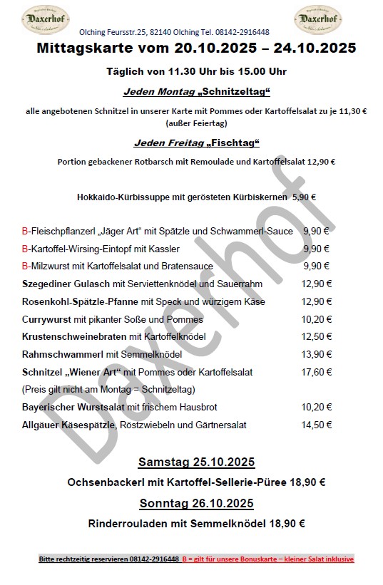 Mittagskarte im Daxerhof ab dem 20.Oktober bis zum 24.Oktober 2025