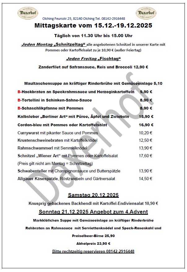 Mittagskarte im Daxerhof ab Montag den 15.Dezember bis zum 19.Dezember 2025