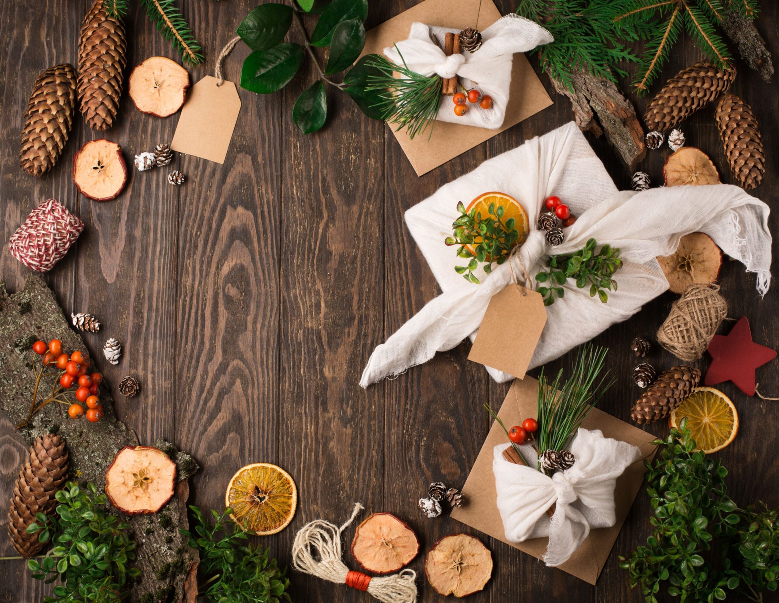 Stilvolle rustikale Geschenke in Leinenstoff mit grünen Zweigen auf einem Holztisch mit Tannenzapfen, Orangen und Äpfeln verpackt. Flach lag er. Einfache Öko-Geschenke plastikfrei. Zero Waste Weihnachten.