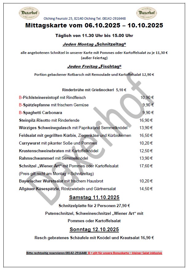 Neue Mittagskarte im Daxerhof ab 6. bis 10.Oktober 2025