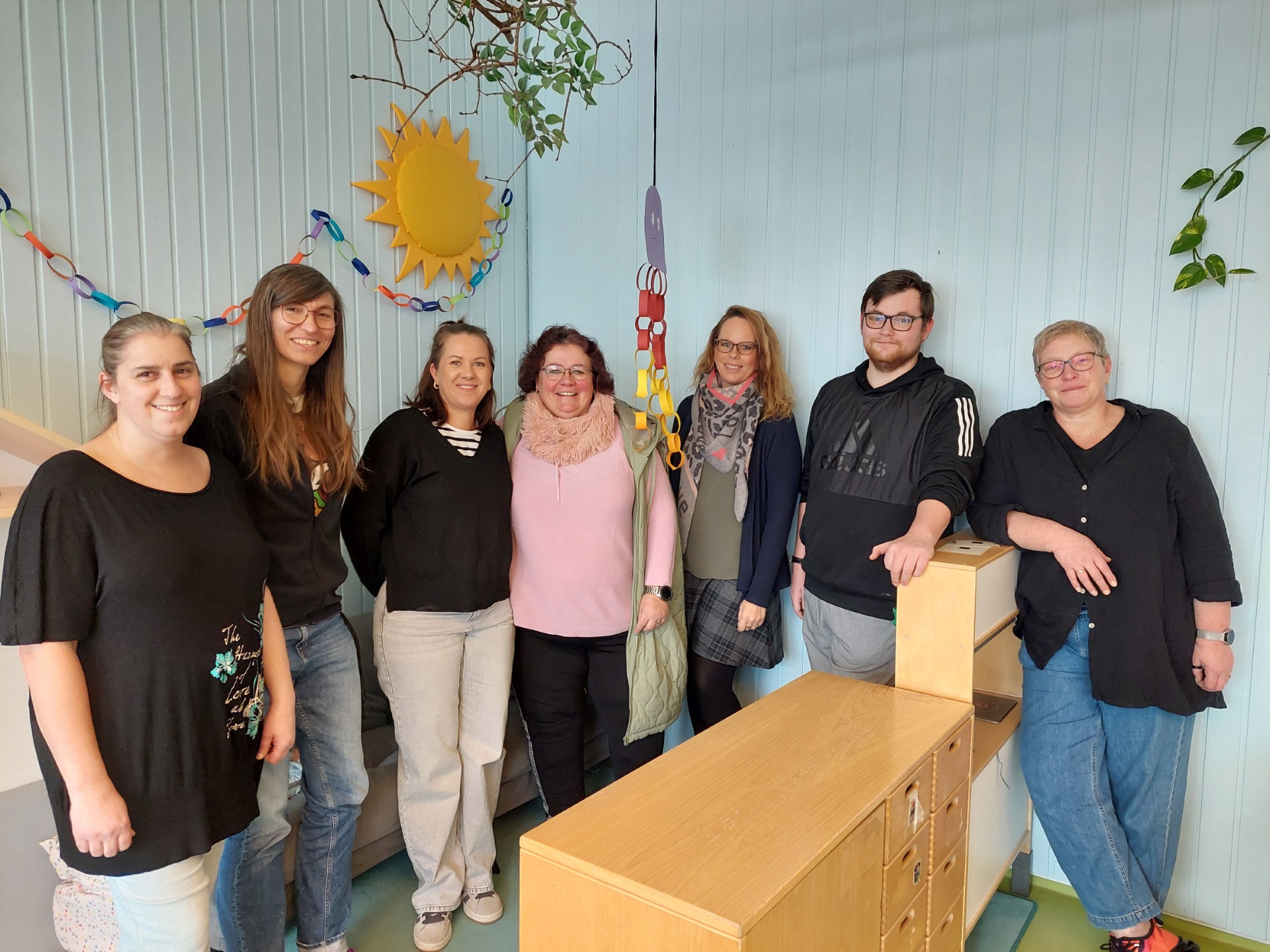 Die Mitarbeiterinnen und Mitarbeiter des Kindergarten, von links nach rechts: Frau Auburger, Frau John, Frau Einertshofer, Frau Niegel, Frau Weber, Herr Schneider, Frau Schneider (Kindergartenleitung)