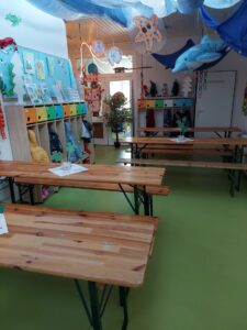 Die großzügige Eingangshalle, in der auch der Neujahrsbruch für die drei Gruppen stattfand, ist das verbindende Herzstück der Einrichtung. Passend zum aktuellen Jahresthema „Meer“ ist der gesamte Kindergarten liebevoll dekoriert und zeigt zahlreiche kreative Arbeiten der Kinder. Diese Gestaltung unterstreicht den pädagogischen Ansatz der Einrichtung, bei dem die Kinder aktiv beteiligt werden und ihre Ideen sichtbar Raum finden.