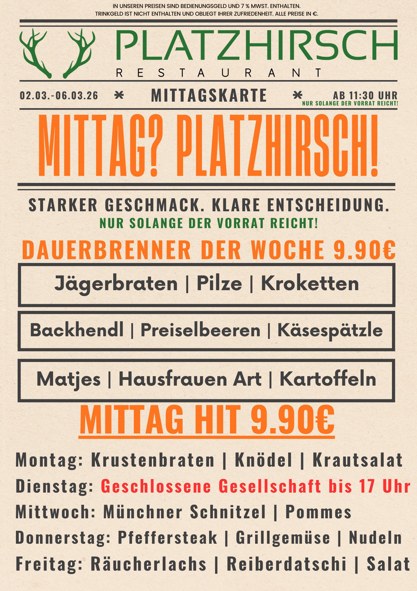 Platzhirsch – Mittagskarte ab dem 2. bis zum 6.März 2026