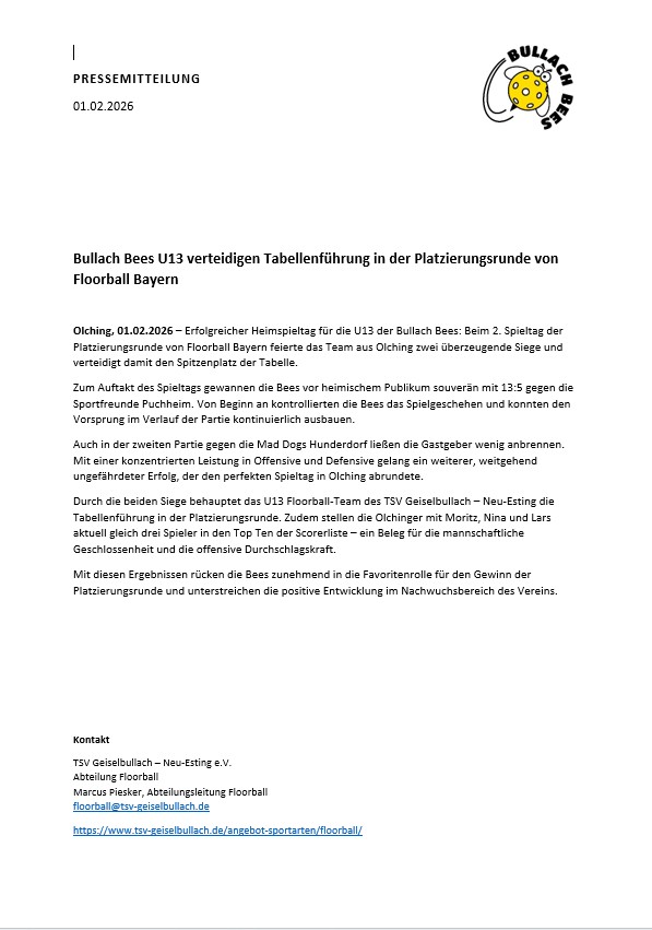 Pressemeldung: Bullach Bees U13 mit zwei Siegen beim Heimspieltag
