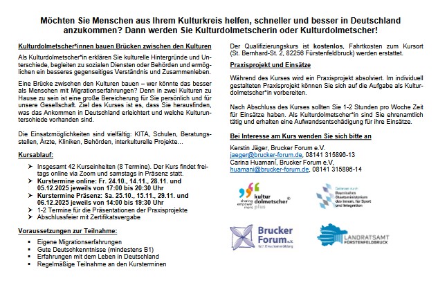 • Zielgruppe: Menschen mit Migrationserfahrung, guten Deutschkenntnissen (mind. B1) und Lust auf ehrenamtliches Engagement