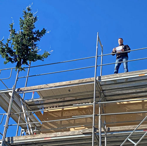 Ein Mitarbeiter der Firma Holzbau Fleischmann leitete mit seinem Richtspruch den nächsten Bauabschnitt ein: