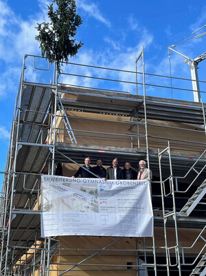 Mit dem Richtfest erreicht das große Schulbauprojekt des Landkreises Fürstenfeldbruck am Gymnasium Gröbenzell einen wichtigen Meilenstein. Nach Abschluss der Rohbauarbeiten verlaufen die nun folgenden Baustellenarbeiten an der Fassade planmäßig. Derzeit werden Fenster eingesetzt, die Holzfassade ist im Aufbau, und das Profilblechdach nimmt Gestalt an. Läuft alles planmäßig, kann der Schulbetrieb im Erweiterungsbau im Laufe des Jahres 2027 starten.