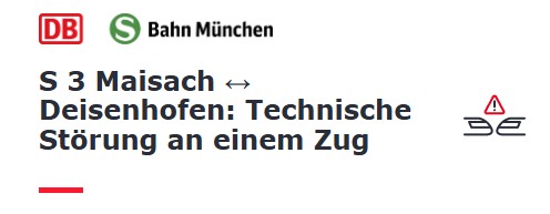 - S 3 Deisenhofen Abfahrt 07:00 Uhr → Ostbahnhof Ankunft 07:15 Uhr / Abfahrt 07:17 Uhr → Maisach Ankunft 07:58 Uhr