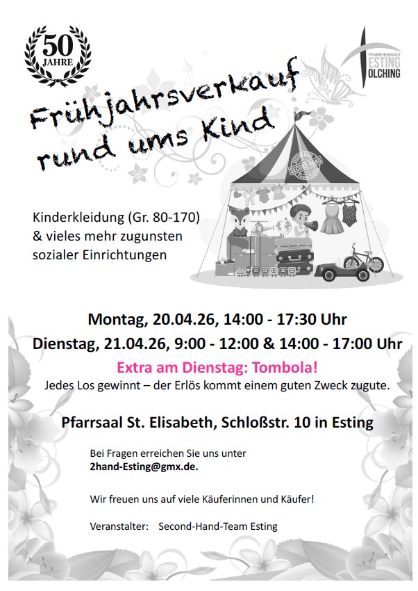 Der beliebte Second-Hand-Verkauf für Kindersachen im Pfarrsaal St. Elisabeth (Schloßstraße 10 in Esting) startet in sein 50. Jubiläumsjahr. Zugunsten karitativer Einrichtungen wird alles rund ums Kind für die Frühjahrs- und Sommersaison von Größe 80 bis 170 angeboten. Bücher und Spielsachen sind bei uns auch zu finden.