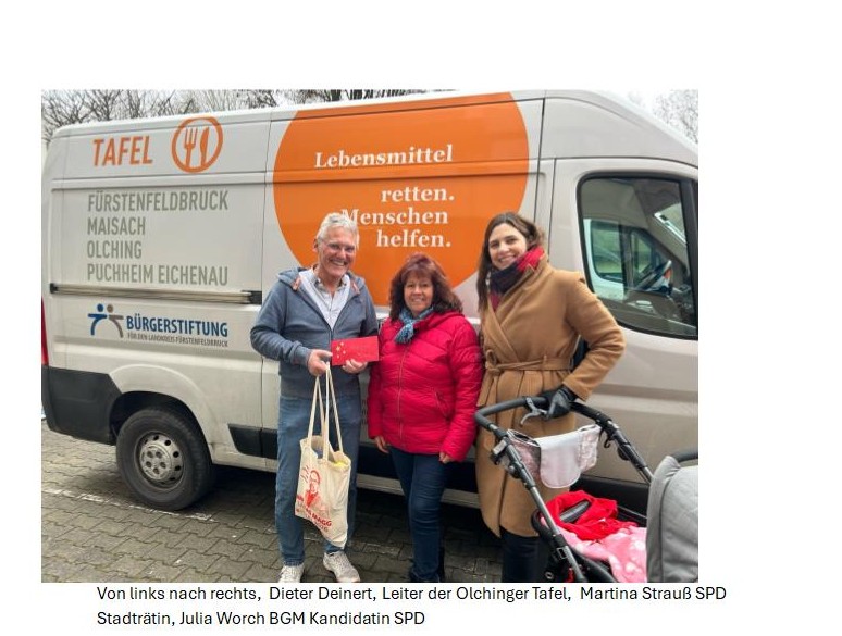 Der Ortsverein der SPD hat in der Vorweihnachtszeit eine großzügige Spende an die Olchinger Tafel übergeben und damit ein starkes Zeichen der Solidarität gesetzt. Mit Lebensmittel und einem Geldgutschein leisteten die Mitglieder einen wichtigen Beitrag zur Unterstützung bedürftiger Menschen vor Ort.
