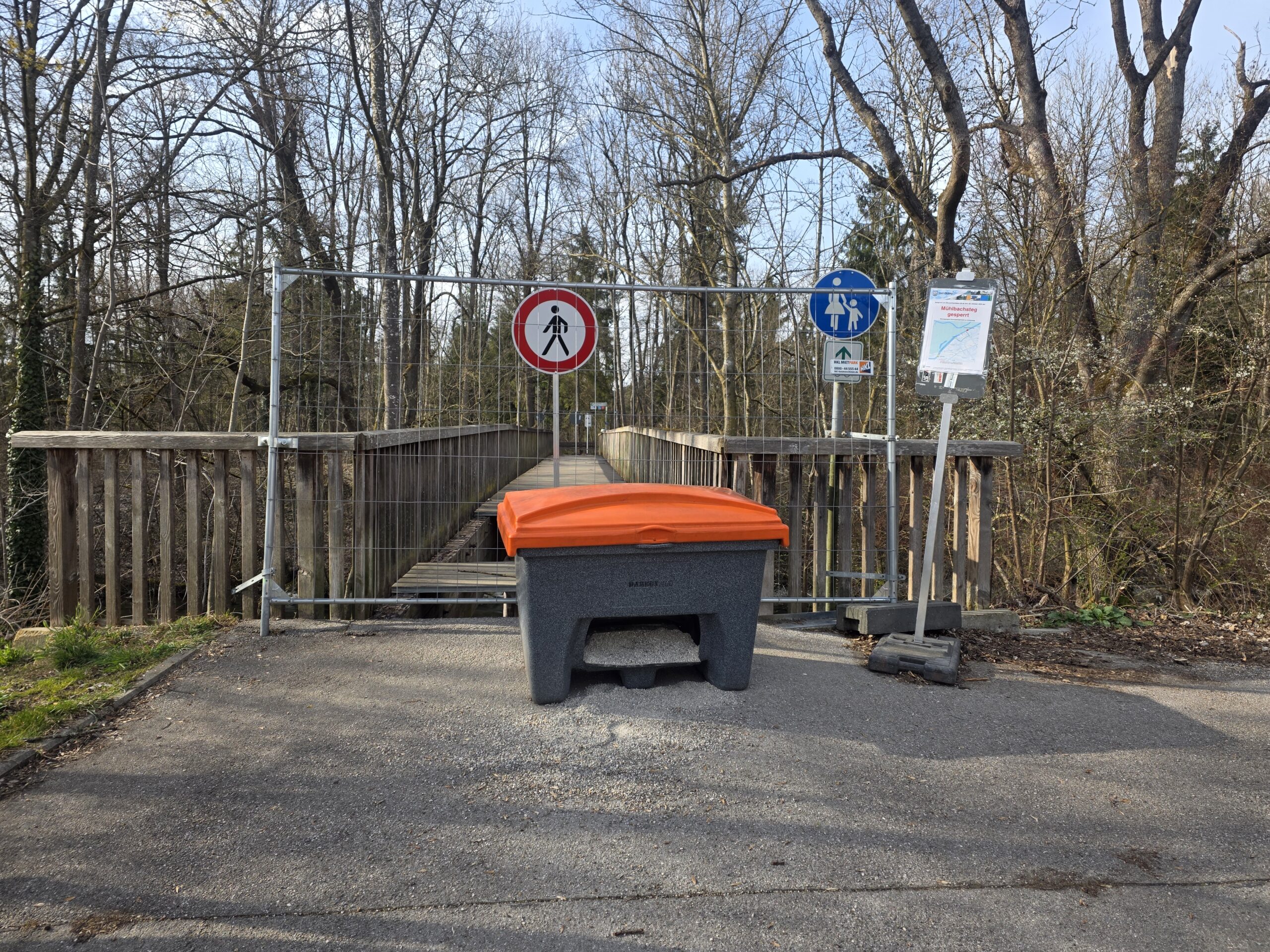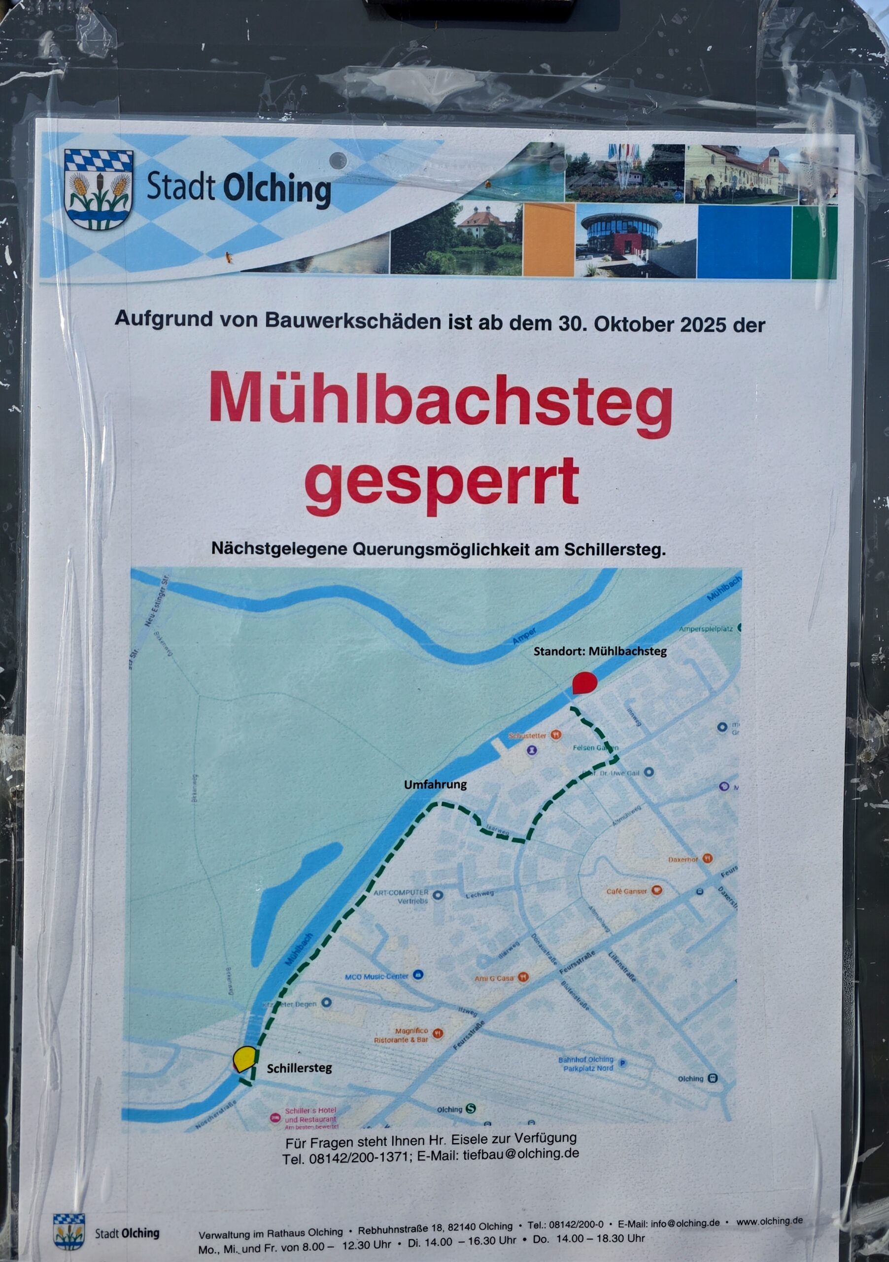In der Stadt Olching ist der Mühlbachsteg aufgrund erheblicher Bauschäden gesperrt worden. Wie auf einer aktuellen Informationstafel vor Ort zu sehen ist, gilt die Sperrung seit dem 30. Oktober 2025 und betrifft die wichtige Fuß- und Radwegverbindung über den Mühlbach.