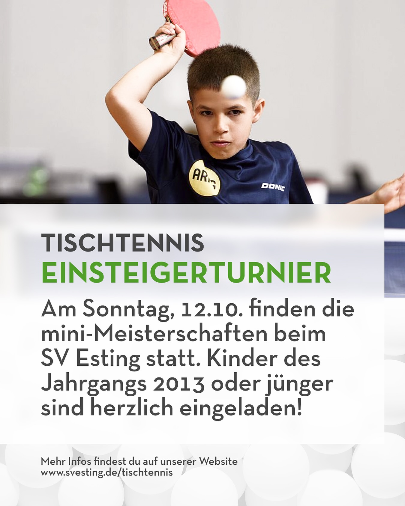 Der Ortsentscheid der mini-Meisterschaften beim SV Esting (12.10.) ist die Auftaktveranstaltung, bei der unabhängig vom Spielniveau teilgenommen werden kann. Ziel dieser Aktion ist es, Kindern den Spaß am Tischtennis näher zu bringen und gleichzeitig erste Wettbewerbserfahrungen zu vermitteln. Die Erstplatzierten erhalten Medaillen und die besten Kinder jeder Altersklasse qualifizieren sich zu einem Folgeturnier, an dem sie teilnehmen können. Auch dort bieten wir Betreuung durch unser Trainerteam an. Für euch ist also immer ein Ansprechpartner vor Ort.