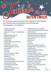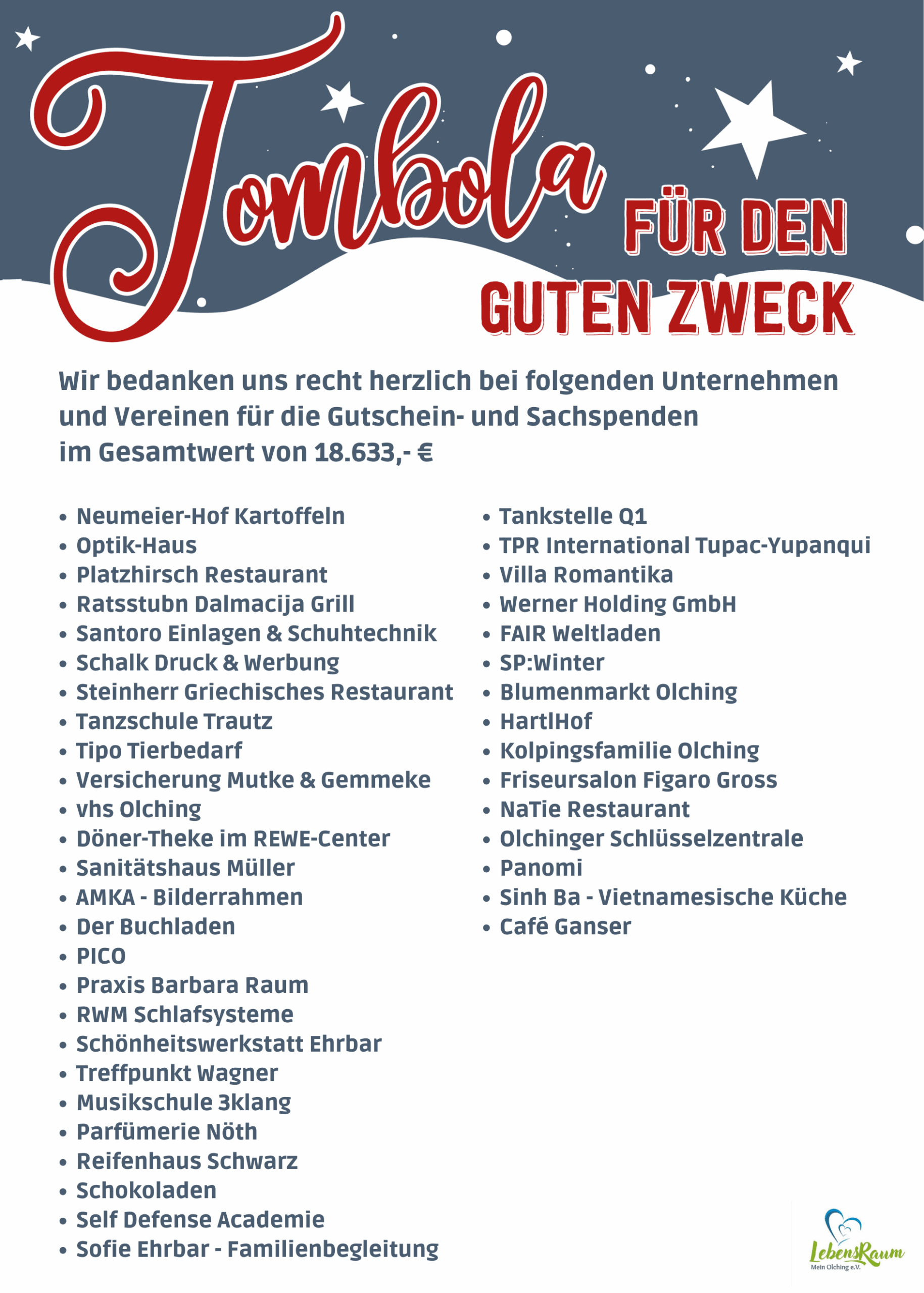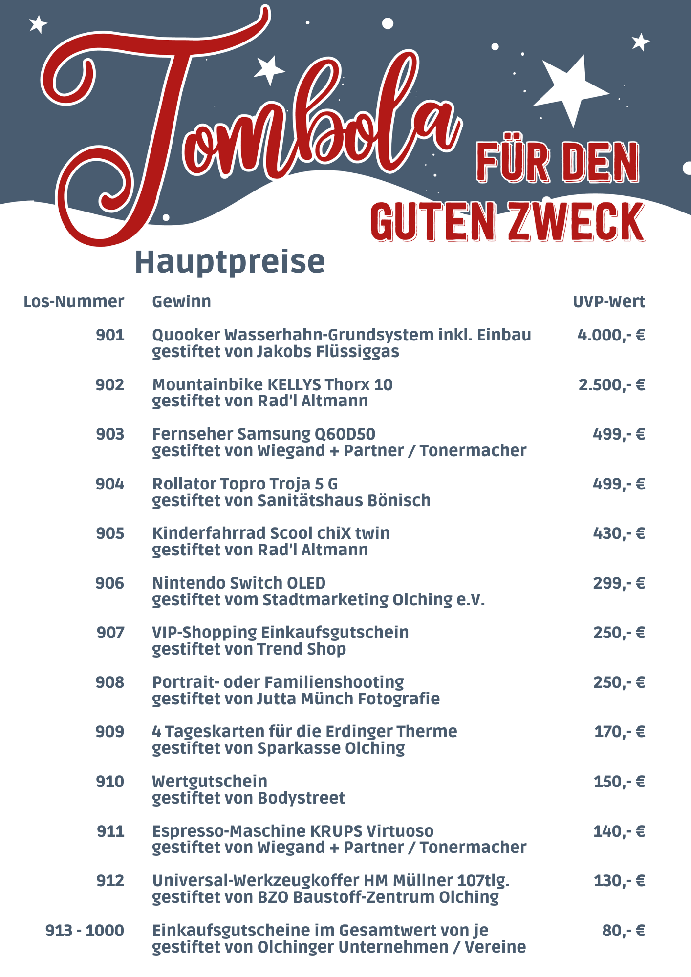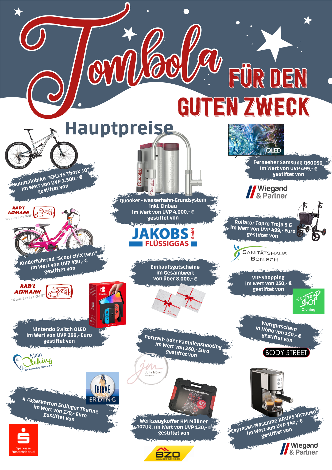 Ein herzliches Dankeschön gilt vor allem den Olchinger Spendenbetrieben für die großartige Unterstützung durch Gutschein- und Sachspenden (Haupt- und Tagespreise) im Gesamtwert von über 18.000,- € und den ehrenamtlichen Helfern, ohne die dies nicht möglich wäre.