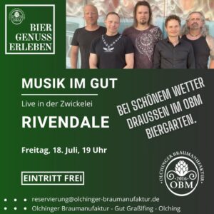 Diese Woche Freitag, den 18. Juli, begrüßen wir vor der Sommerpause von Musik im Gut zum zweiten Mal die Rock Giganten von Rivendale. Bei schönem Wetter bereist ab 18 Uhr im Biergaren und sonst wie gewohnt ab 19 Uhr auf der Bühne in der Zwickelei. Der Eintritt ist wie immer frei und der Hut geht rum. Rivendale steht für melodiösen Hard Rock: Mehrstimmige Vocals, Keyboards und Hammond, Gitarren, Bass und Drums. Das alles live und ohne Einspieler, mit viel Leidenschaft und Spielfreude. Dabei kommen sowohl Eigenkompositionen als auch ausgewählte Coversongs aus den 70ern und 80ern auf die Bühne. Vor allem solche Songs, die nicht jede Coverband spielt, liegen Rivendale am Herzen. Kommt vorbei und reserviert sehr gerne vorab über reservierung@olchinger-braumanufaktur.de.