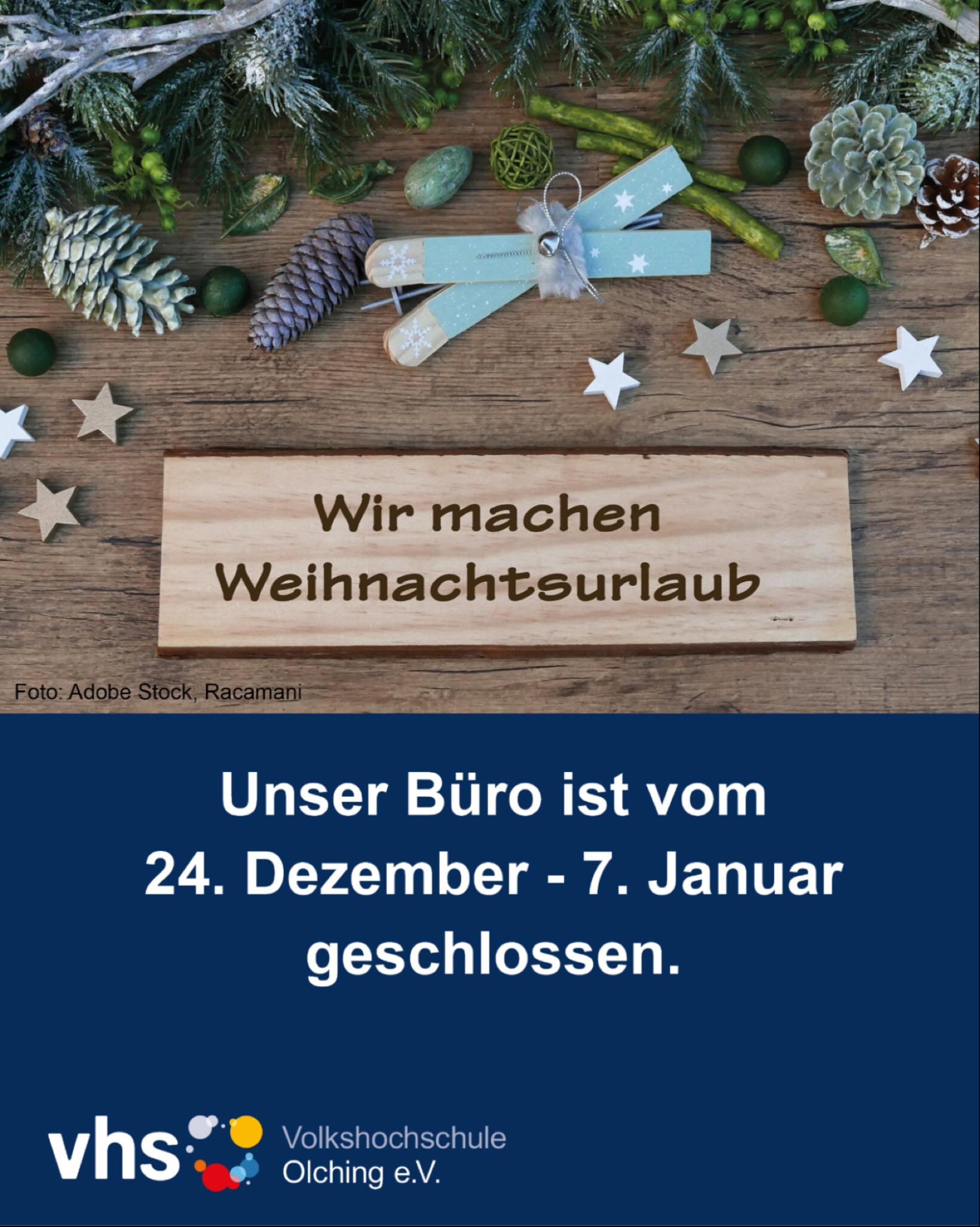 Bitte beachtet, dass unser Büro vom 24.12. bis 7.1. geschlossen ist. Wir sind per E-Mail an info@vhs-olching.de erreichbar und Online-Anmeldungen können natürlich jederzeit vorgenommen werden. Ab Donnerstag, den 8.1., sind wir wieder persönlich für euch da.